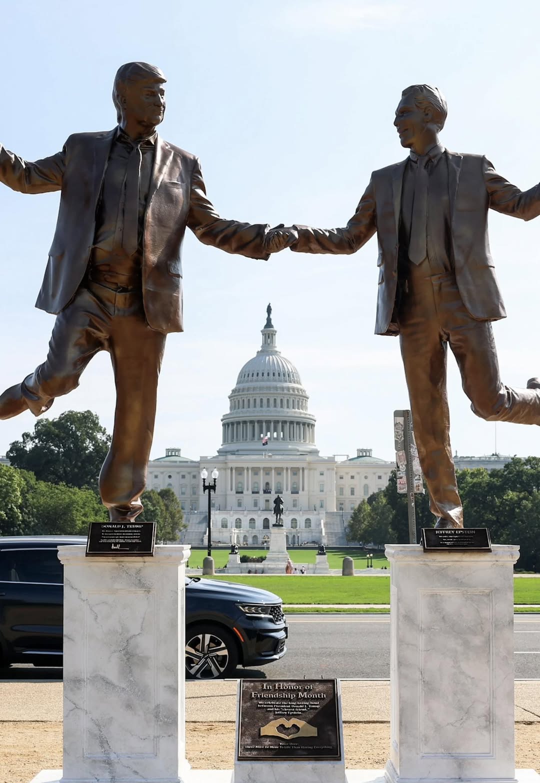 A protest sculpture depicting Trump with convicted sex offender Jeffrey Epstein appeared briefly on the National Mall in Washington, D.C., bearing the caption “Best Friends Forever.” (This photo was shared with us the piece was installed by an anonymous artist collective.)