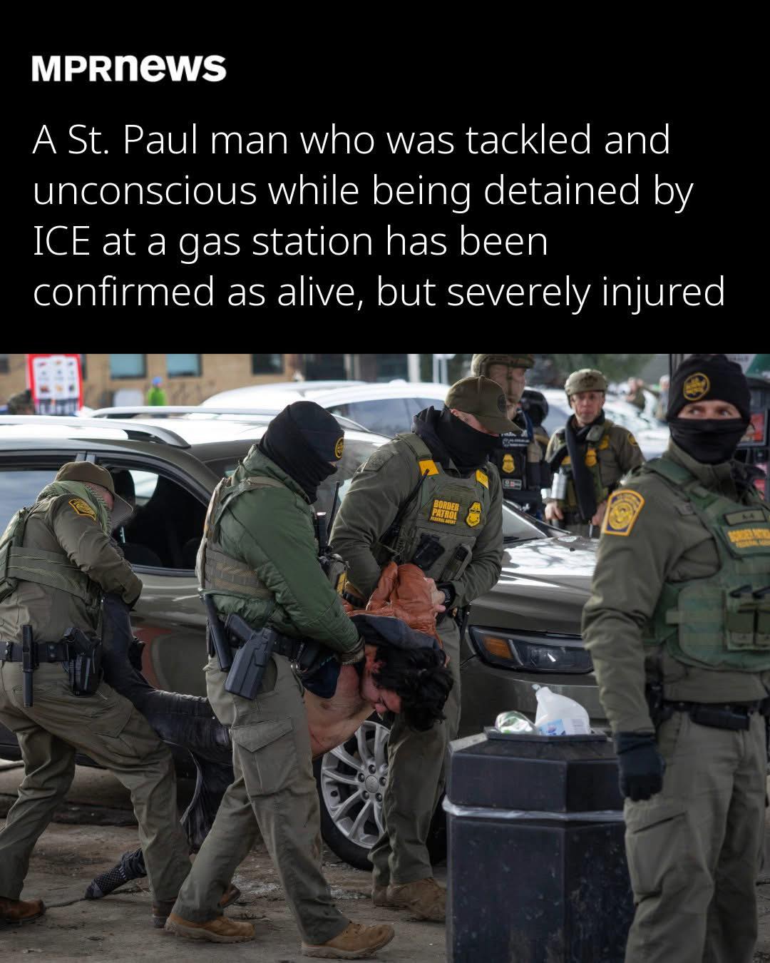 A viral video circulating online showed a man appearing unconscious after being tackled and restrained by federal agents at a Speedway gas station in St. Paul. Social media users feared he might have died, but his sister, Consuelo Henriquez, that he is alive and currently in custody at a detention facility in El Paso, Texas. 🙏 💚
