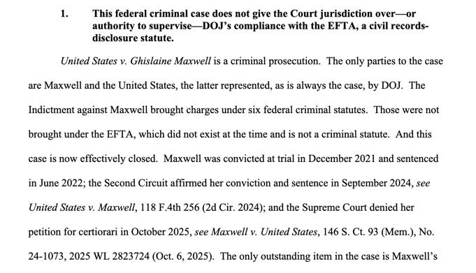 There were certain files that were filed *in the criminal U.S. v. Maxwell case* that the DOJ also has possession of and that are also responsive to the mandate of the EFTA. Those files were under a protective order *in the criminal case*. The DOJ asked Judge Engelmayer to remove the protective order *in the criminal case*, so that they could produce those same files as required by the EFTA.