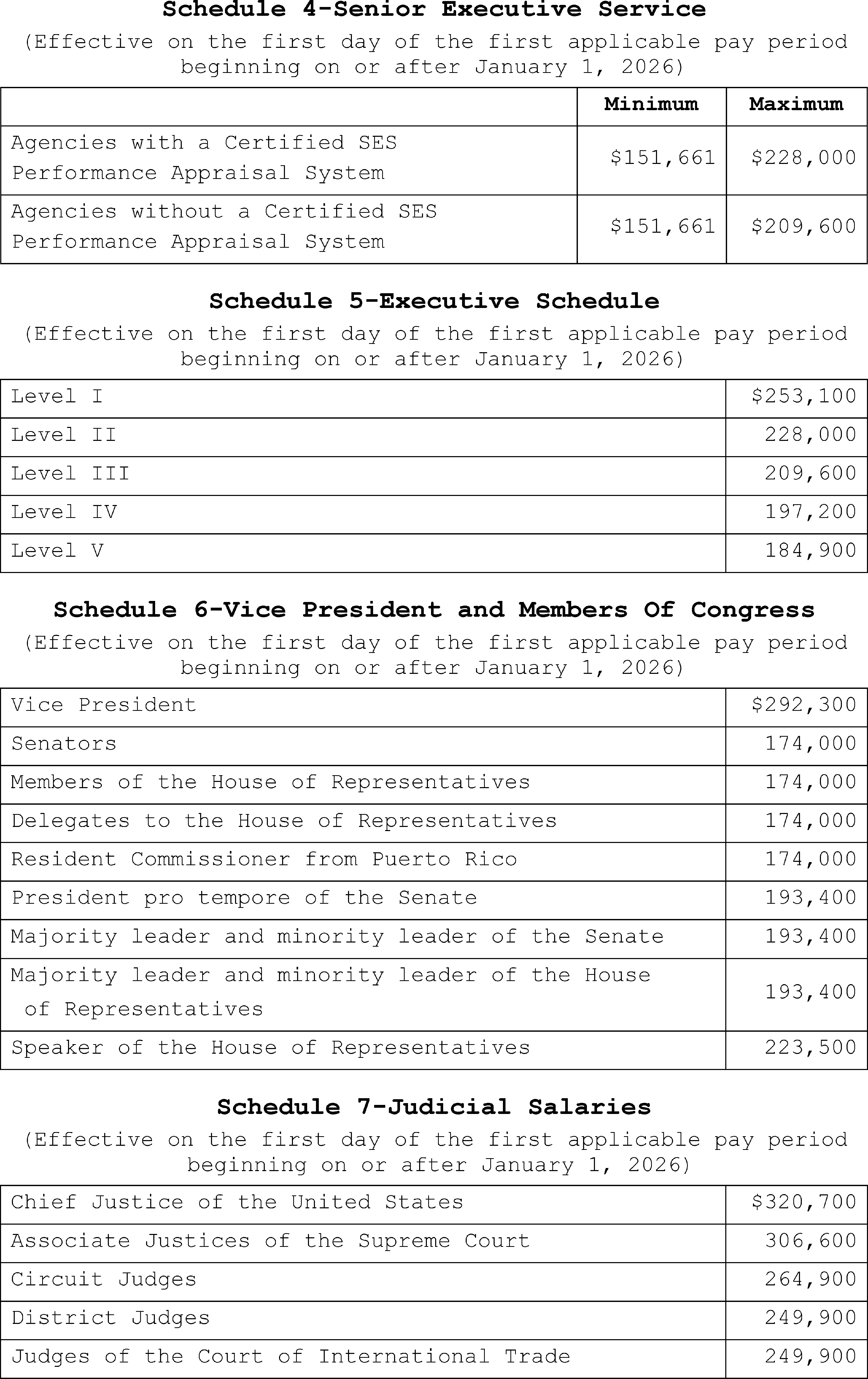 The ranges of rates of basic pay for senior executives in the Senior Executive Service, as established pursuant to 5 U.S.C. 5382, are set forth on Schedule 4 attached hereto and made a part hereof.