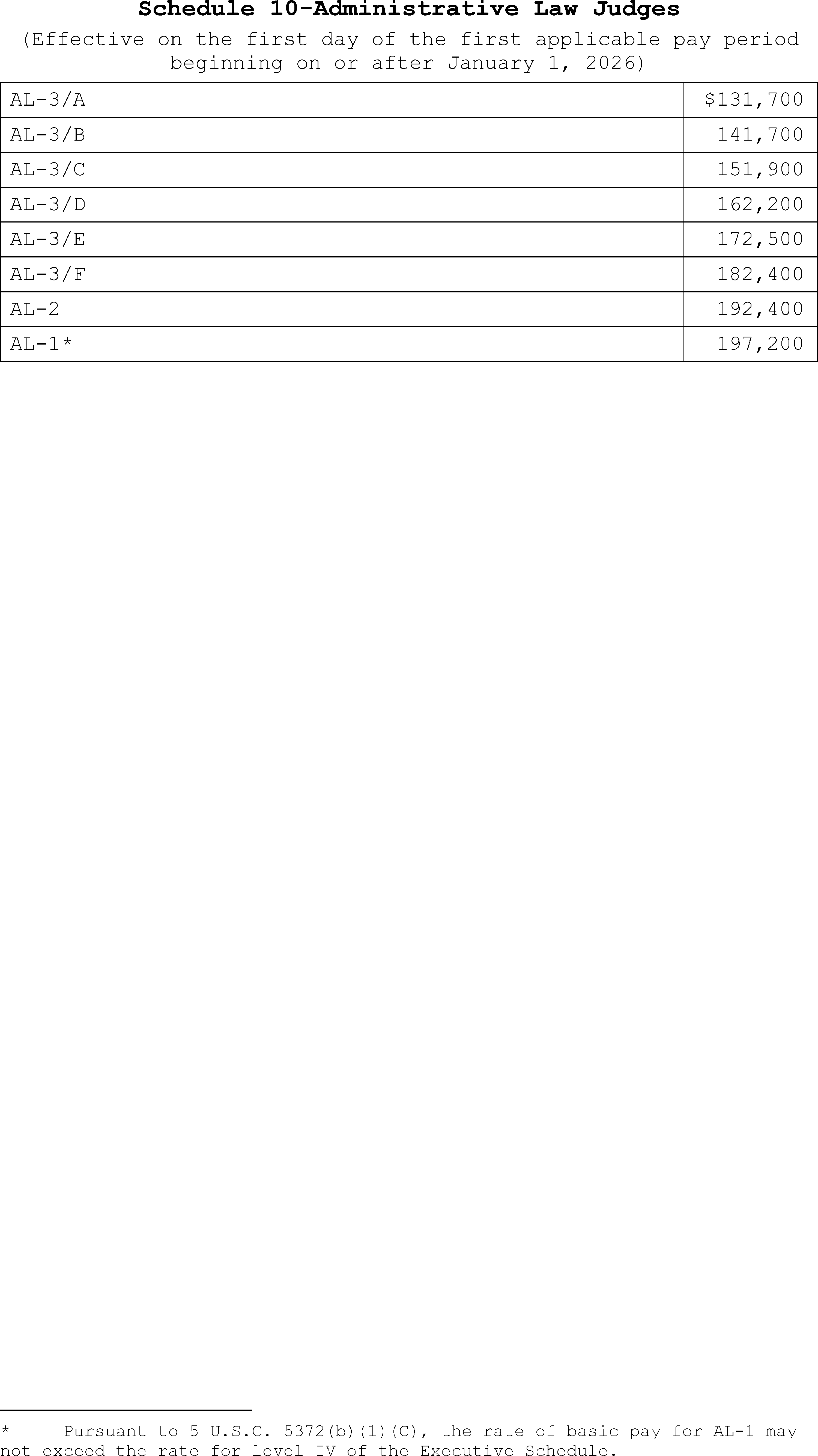 Pursuant to section 5372 of title 5, United States Code, the rates of basic pay for administrative law judges are set forth on Schedule 10 attached hereto and made a part hereof.