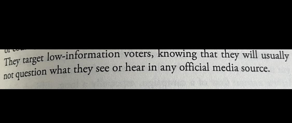 “They target low-information voters, knowing that they will usually not question what they see or hear in any official media source.”