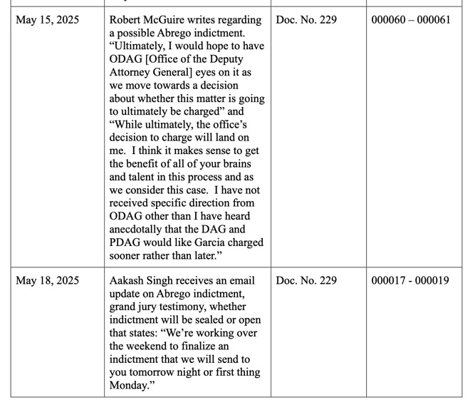 Says Judge Crenshaw, in the order (again, included for Notes members), "The Court has reviewed in camera over 3,000 documents that the government produced for review. For the reasons that follow, the Court will: (1) grant in part Abrego’s motion to compel discovery and require the government to disclose to Abrego a sub-set of the over 3,000 documents that are relevant to the narrow issue of whether the government’s new decision to prosecute Abrego, after deciding not to do so, “was tainted by improper motivation” arising from Abrego’s success in the Maryland civil case."