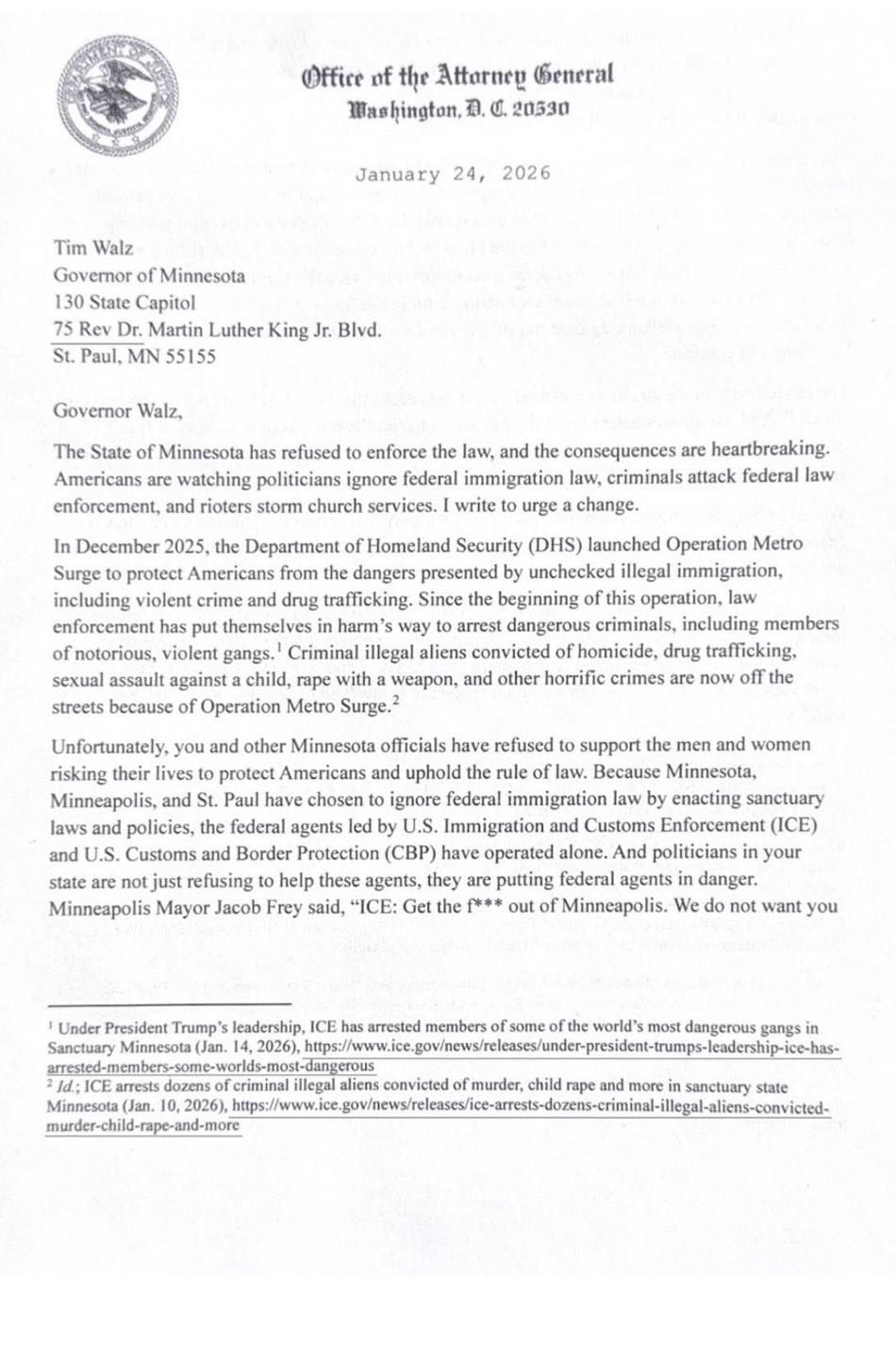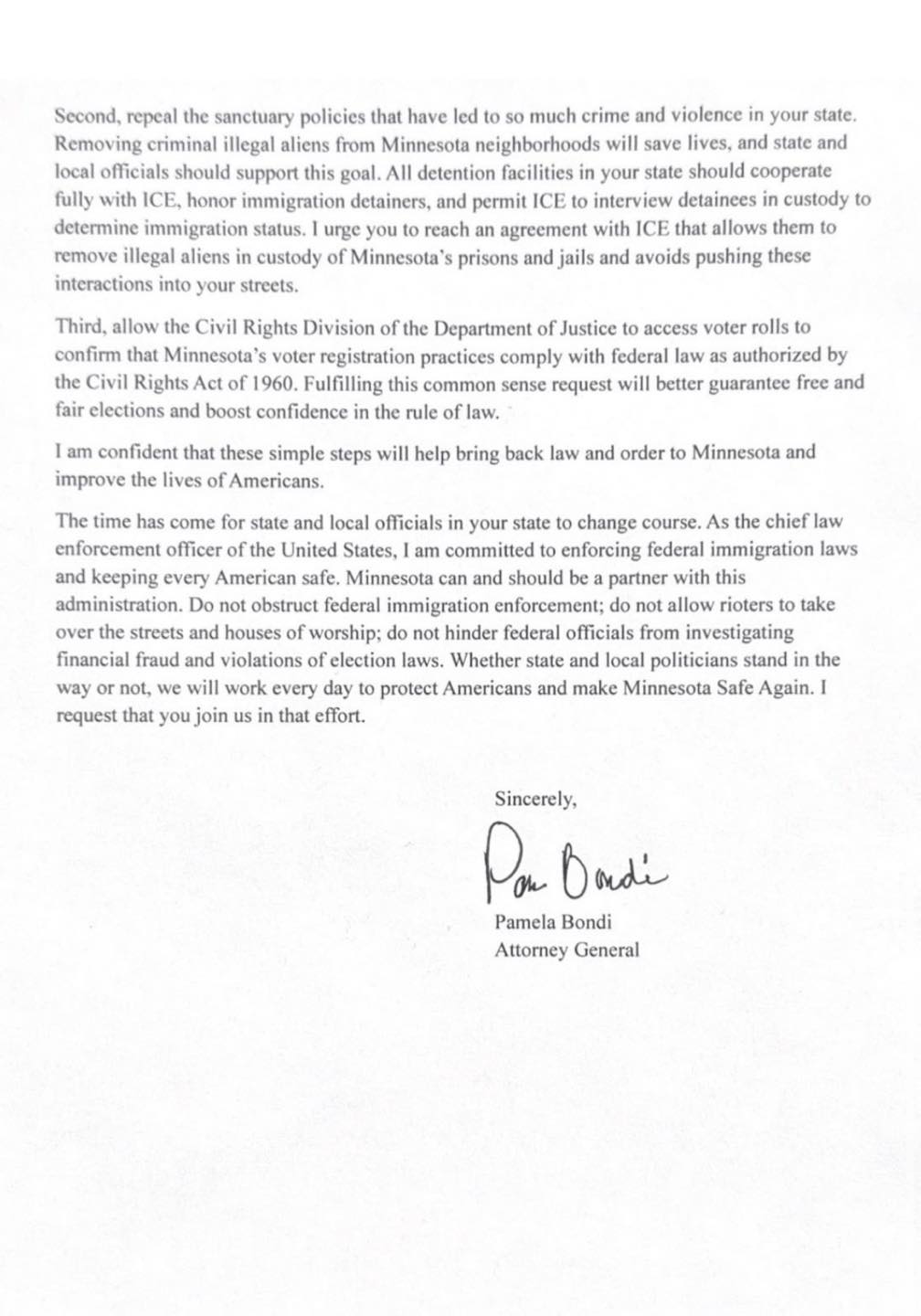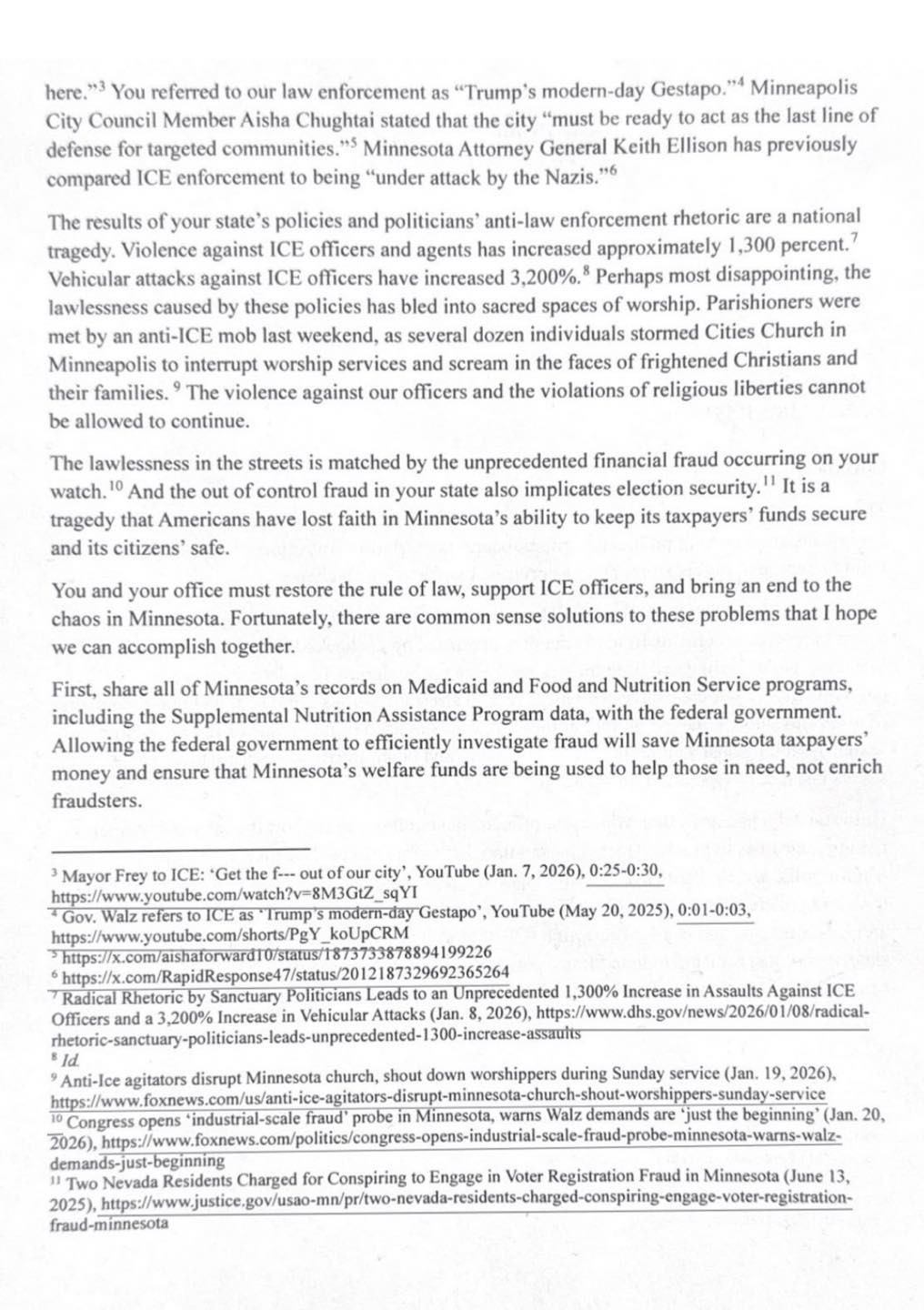 Foxtrot Papa Bravo! This letter isn’t about public safety. It’s a federal demand that Minnesota abandon local control, hand over sensitive data, and treat dissent as criminal behavior. Calling protest “lawlessness,” faith communities “mobs,” and local governance “obstruction” is how they justify overreach. We see it for what it is. Minnesota does not need permission to protect its people, its rights, or its democracy.
