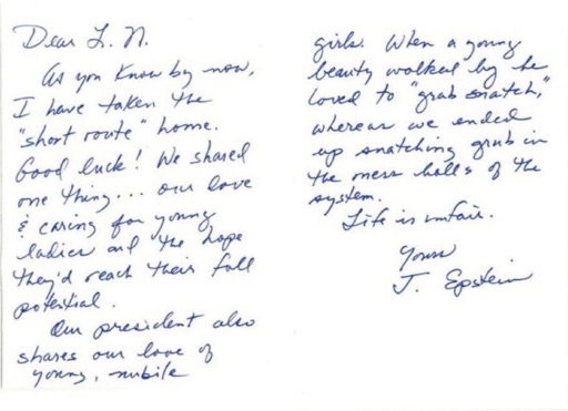 Here’s the content of the card, note how he pitches his and Larry’s own love for young girls as caring about them, and Trump’s as “grabbing snatch”: