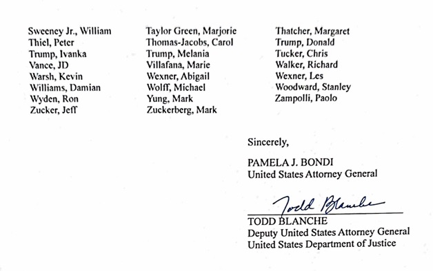 I HAVE THE FULL VALENTINE’S DAY LETTER THAT BONDI SENT TO CONGRESS WITH THE ‘FULL’ LIST OF “POLITICALLY EXPOSED” PEOPLE IN THE EPSTEIN FILES