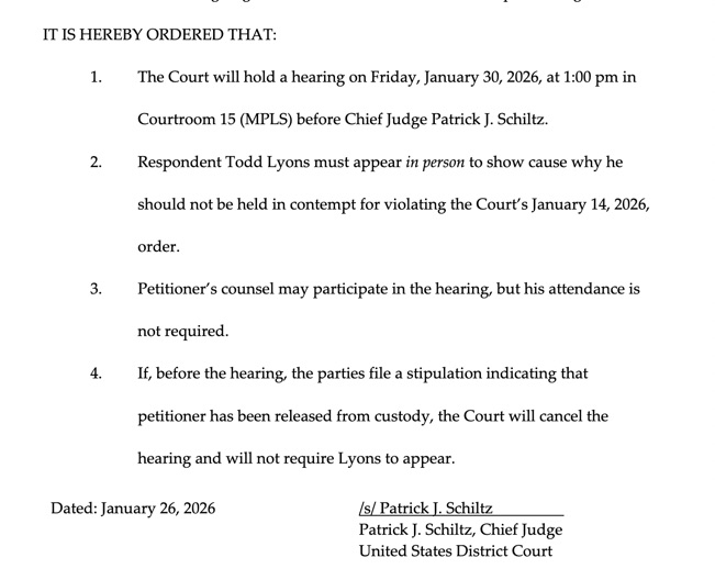 For those of you who haven’t yet guessed (or looked at the signature on the screenshot), it’s none other than Judge Schiltz! I told you about Judge Schiltz yesterday when I explained that the administration had attempted to go around CHIEF District Court Judge Schiltz to get the 8th Circuit to issue a Writ of Mandamus or to issue an arrest warrant for journalist Don Lemon. Not only that, but they had *filed their request under seal*, effectively shutting out Judge Schiltz from being able to read the very thing about which he needed to render an opinion!