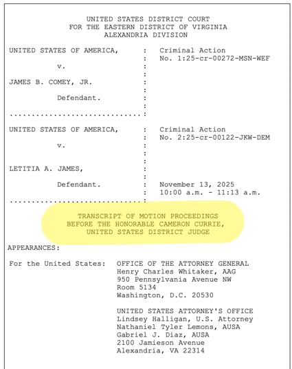 THE COURT: Let me ask you this. I was involved in 25 receiving in camera provisions of the grand jury transcripts and tapes, and it became obvious to me that the attorney general could not have reviewed those portions of the transcript of the Comey presentation by Ms. Halligan which preceded and came after her presentation of the witness testimony in the case. There also is a missing section of what occurred between 4:28 and the return of the grand jury indictment, and it appears to me that there was no court reporter present, or if he or she was present, did not take down what happened during that time period. So how does the attorney general ratify and say that she has reviewed the grand jury transcripts when they did not exist in the records of the Justice Department at that time?