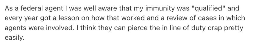 “As a federal agent I was well aware that my immunity was “qualified” and every year got a lesson on how that worked and a review of cases in which agents were involved. I think they can pierce the in line of duty crap pretty easily.”
