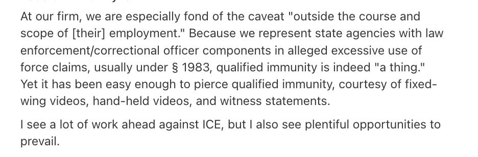 “At our firm, we are especially fond of the caveat “outside the course and scope of [their] employment.” Because we represent state agencies with law enforcement/correctional officer components in alleged excessive use of force claims, usually under § 1983, qualified immunity is indeed “a thing.” Yet it has been easy enough to pierce qualified immunity, courtesy of fixed-wing videos, hand-held videos, and witness statements. I see a lot of work ahead against ICE, but I also see plentiful opportunities to prevail.”