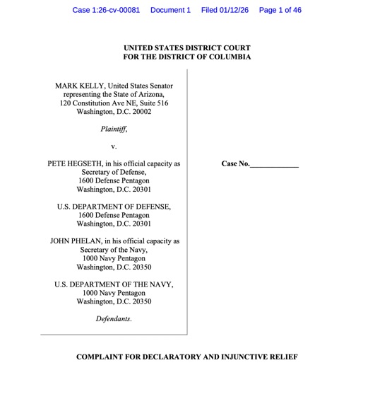 In a 46-page complaint *just now* filed with the Court (included for Notes from the Front members) Mark Kelly just sued Pete Hegseth for, among other things, violation of the First Amendment, for violation of the Speech and Debate clause, and for generally being a dick. (Ok, that last one isn’t a real legal cause of action, but perhaps it should be.)