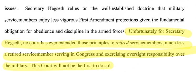 This opinion is also a *fantastic* review of the basics of the 1st Amendment! This is because Hegseth largely predicates his defense on the legal premise that service members have somewhat curtailed 1st Amendment rights. That is true. FOR ACTIVE DUTY MEMBERS (where it arguably makes sense). But NOT for *retired* military personnel!
