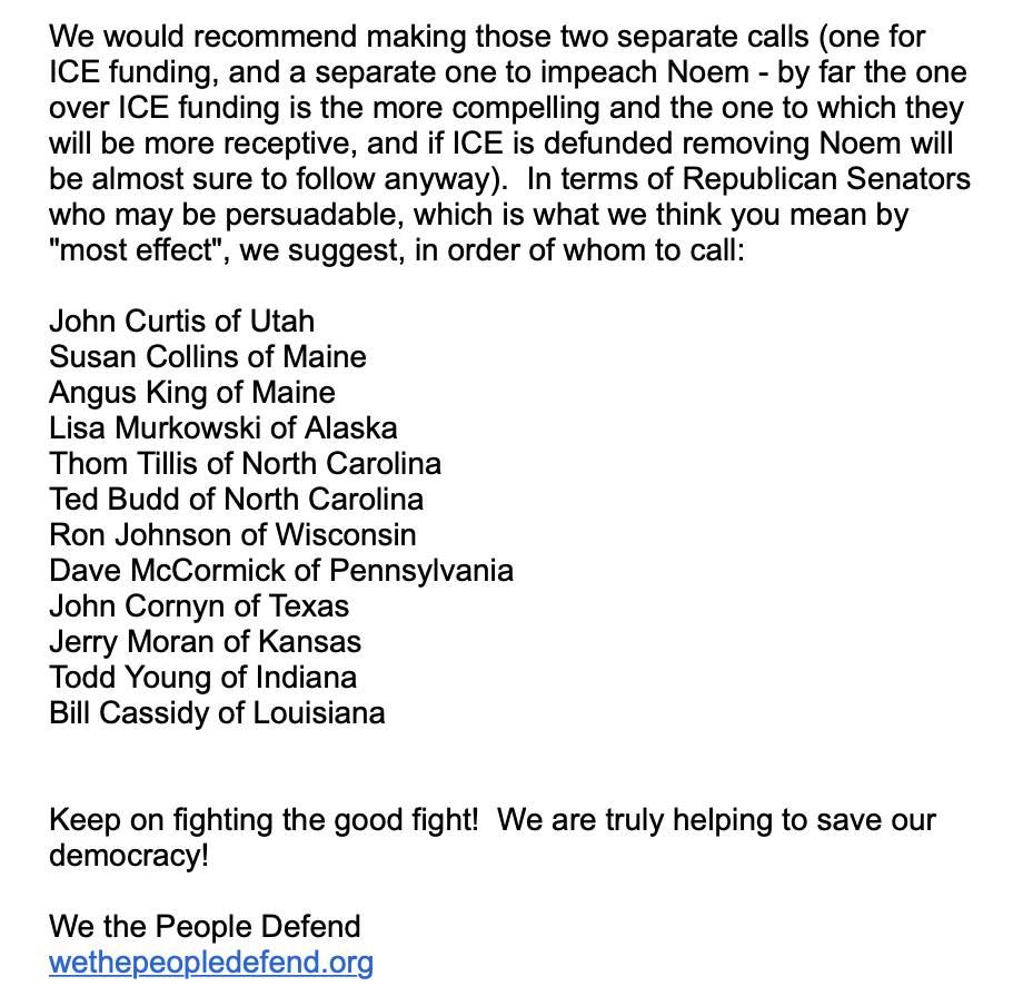 Over at We the People Defend we received a question about which Republican Senators to contact to ask them to seriously consider declining to further fund ICE, and also to ask them to impeach Noem. In other words which Republican Senators were potentially persuadable as compared to others, and I thought that I’d share our answer with you. We recommend only asking them one thing per call (in this case to withhold funds from ICE). Here is the list of Senators we provided, in order of whom to call, note that these are their D.C. offices, but if you look up their local offices you are much more likely to reach a live person there: