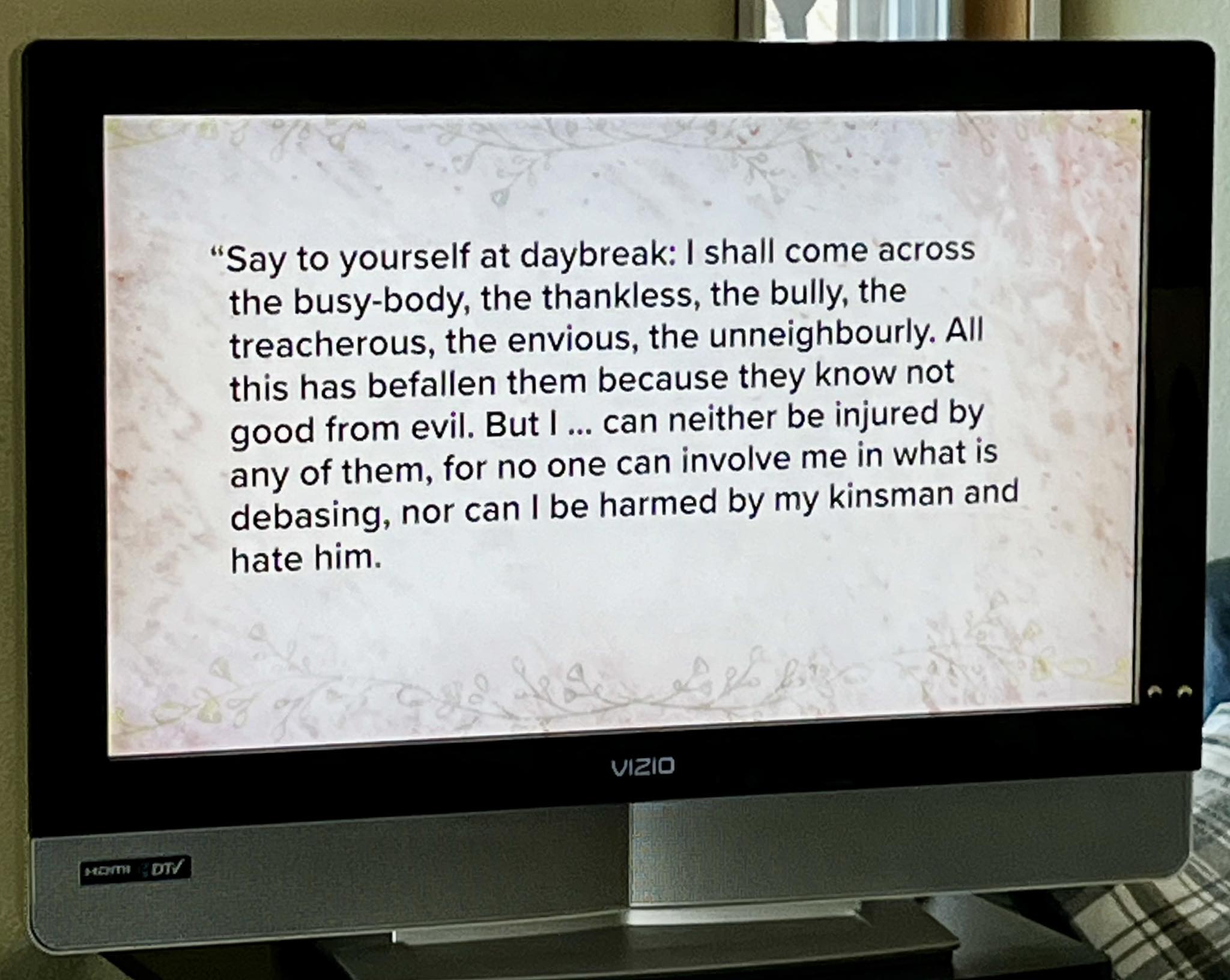 “Say to yourself at daybreak: I shall come across the busy-body, the thankless, the bully, the treacherous, the envious, the unneighbourly. All this has befallen them because they know not good from evil. But I … can neither be injured by any of them, for no one can involve me in what is debasing, nor can I be harmed by my kinsman and hate him”