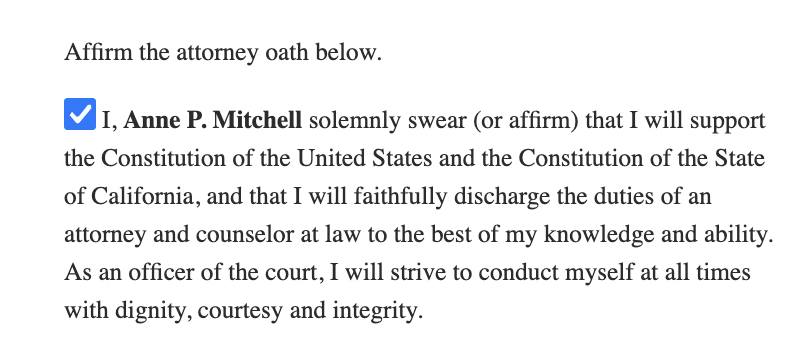 This is the oath which I have to reaffirm every year. I’m certain that attorneys who are licensed in other states also have to reaffirm similar oaths. In my opinion, at this point any attorney who is working supporting what Trump and this administration are doing is violating their oath. P.S. How many of you knew that that attorneys are officers of the court? (NOTE: PLEASE do *not* comment asking me what you can do about attorneys violating their oaths- the answer is report them to their *state* bar association if they are *truly*, *blatantly* violating their oath, but just like anything else in the law, *you* don’t get to decide if they are actually violating their oath, the state bar adjudicatory authority does. The ABA does *not* have anything to do with it.)