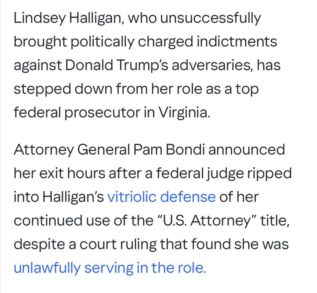 “Lindsey Halligan, who had unsuccessfully brought politically charged indictments against Donald Trump’s adversaries, has stepped down from her role as a top federal prosecutor in Virginia. Attorney General Pam Bondi announced her exit hours after a federal judge ripped into Halligan’s vitriolic defense of her continued use of the “U.S. Attorney” title, despite a court ruling that found she was unlawfully serving in the role.”
