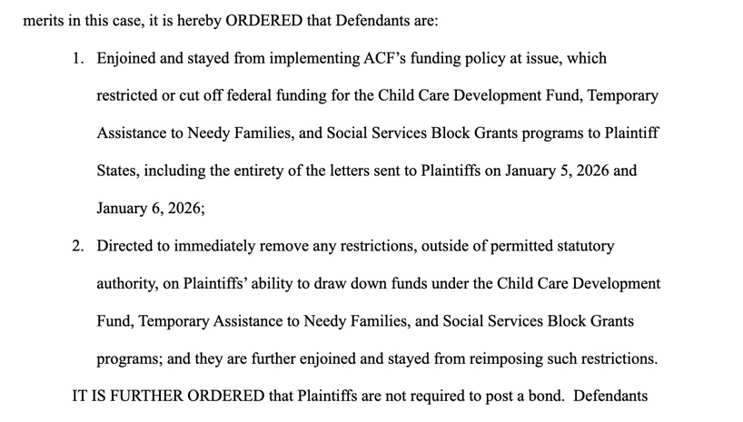 On Friday, U.S. District Court Judge Vernon Broderick put in place a preliminary injunction and ordered that the administration, including RFK Jr., who is a named defendant, release, and remove any restrictions inhibiting the states from accessing, the funds that had been frozen under a new policy, “which restricted or cut off federal funding for the Child Care Development Fund, Temporary Assistance to Needy Families, and Social Services Block Grants programs.” That policy had attempted to freeze and withhold *$10 billion* in child care funds. (Note: this is a preliminary injunction, the Courts still need to decide the actual merits of the case.)