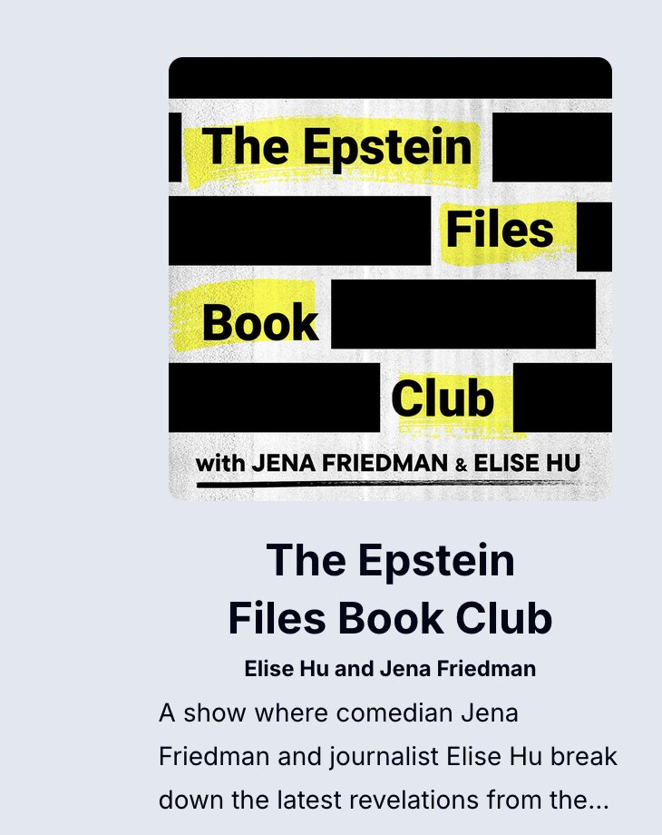 Here’s a bit about the Epstein Files Book Club: “The Epstein Files Book Club is a show where comedian Jena Friedman and journalist Elise Hu break down the latest revelations from the trove of documents released about convicted sex offender Jeffrey Epstein and his sprawling network of powerful people to try to understand whatβs real, whatβs not and what we can do about it.”
