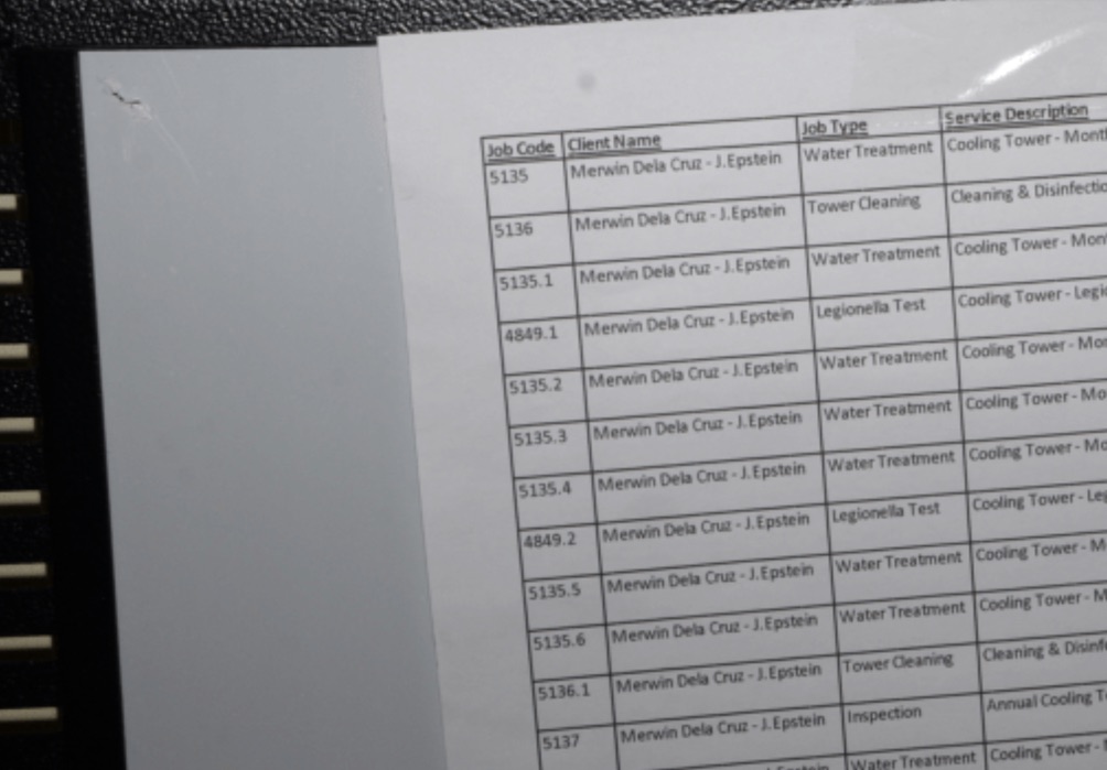 So I zoomed in on the maintenance sheet and found that each entry bore the name “Merwin Dela Cruz”. Doing some more sleuthing, I found Merwin Dela Cruz – in the actual transcript of Maxwell’s trial. Not a deposition, the *actual trial*, which includes descriptions of some of the actual evidence found in Epstein’s residences.