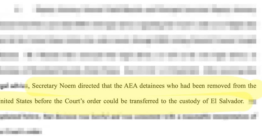 “Deputy Attorney General Todd Blanche and Principal Associate Deputy Attorney General Emil Bove provided DHS with legal advice regarding the Court’s order as to flights that had left the United States before the order issued, through DHS Acting General Counsel Joseph Mazzara. Mr. Mazzara then conveyed that legal advice, as well as his own legal advice, to Secretary of Homeland Security, Kristi Noem. After receiving that legal advice, *Secretary Noem directed that the AEA detainees who had been removed from the United States before the Court’s order could be transferred to the custody of El Salvador.*