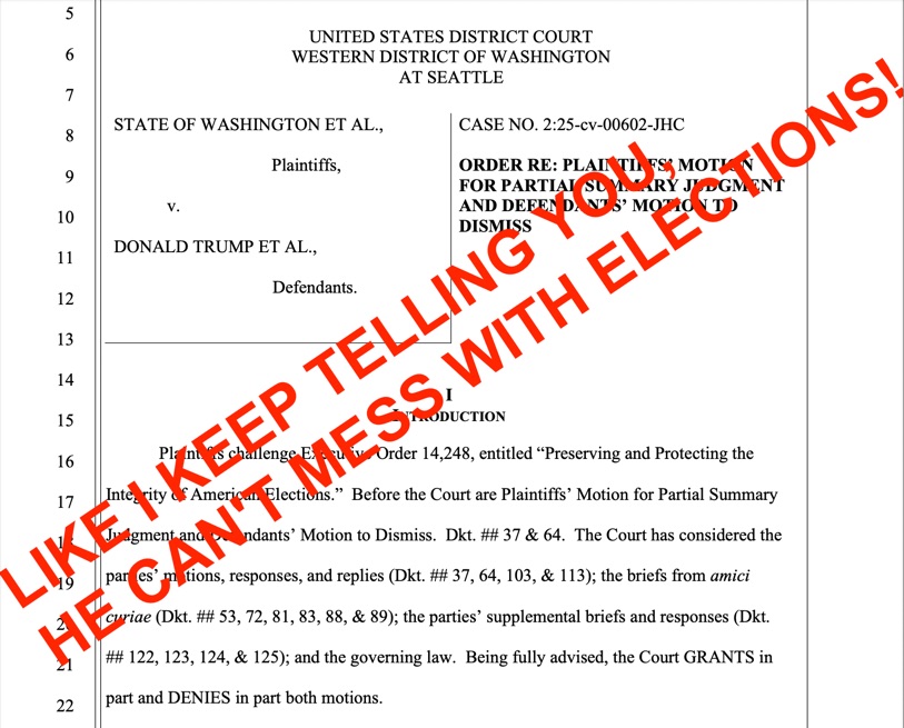I keep telling you that he can’t interfere with elections. Some of you seem not to believe me, so maybe you will believe a Federal court (actually a *second* Federal court). (Hey, bookmark this post so that you can refer back to it when you see someone else saying “if there even are any elections.”)