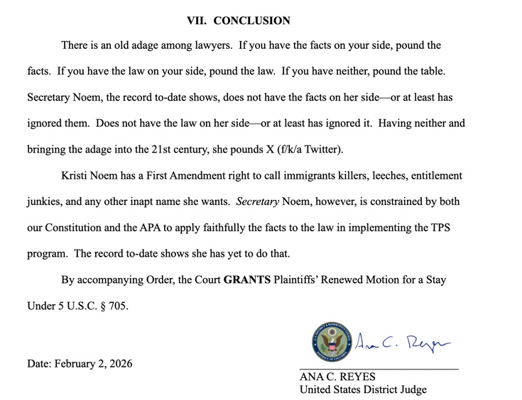 In a *scathing* 83-page opinion (included for Notes from the Front members) U.S. District Judge Ana Reyes absolutely *pummels* Noem for her handling of, well, everything, although this particular opinion is about the administration trying to take away the Temporary Protected Status (TPS) for thousands of Haitians. I’m going to jump to the end first, because it is just *so* delightful!